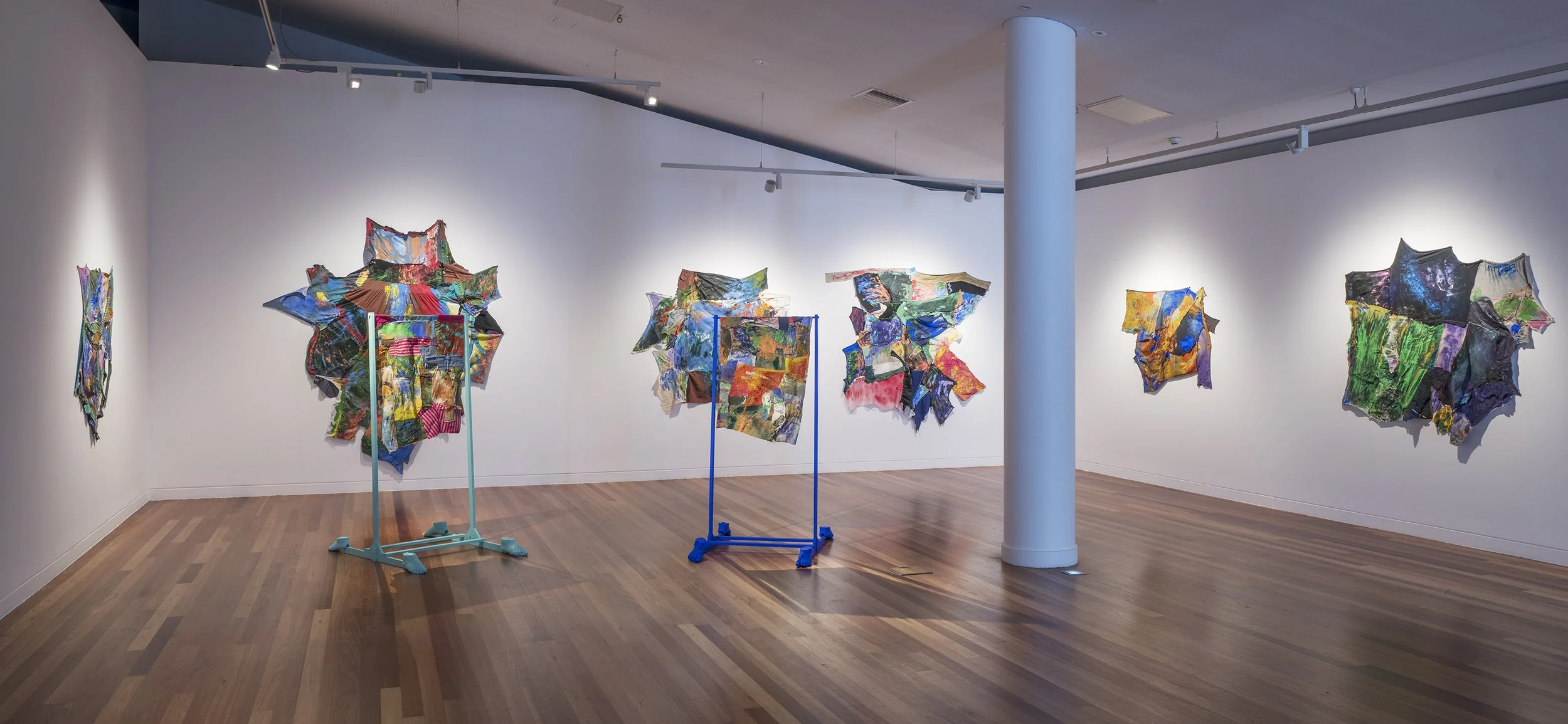 Images: Sophia Childs, Assortment 2024, acrylic on assorted donated textiles stitched together, dimensions variable. Photo by Brenton McGeachie.